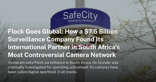 Beep@lemmus.orgEnglish · 7 days agoFlock Goes Global: How a $7.5 Billion Surveillance Company Found Its International Partner in South Africa's Most Controversial Camera Networkplus-squarehaveibeenflocked.comexternal-linkmessage-square0linkfedilinkarrow-up16