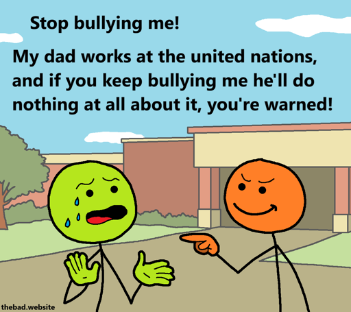 My dad works at the United Nations, and if you keep bullying me he’ll do nothing at all about it, you’re warned!