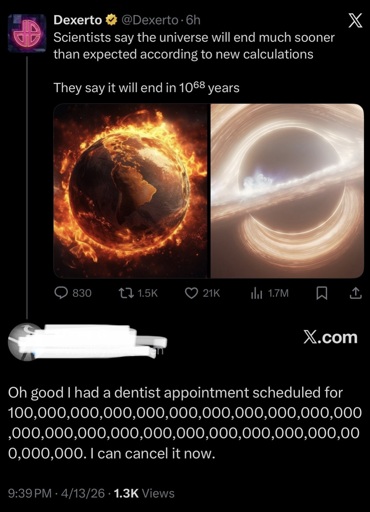 arrow-up11imageWhew no need to continue flossing. lemmy.worldWanderWisley@lemmy.world to Science Memes@mander.xyzEnglish · 7 days agomessage-square0linkfedilink